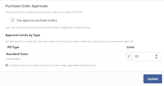 £ Limits by Type: You must set a maximum value for each Purchase Order Type.