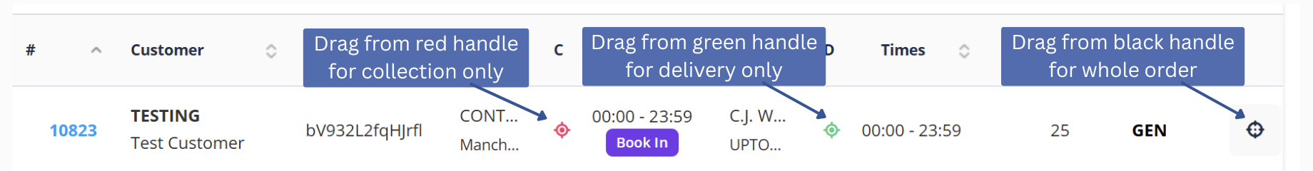 - Full Trip (Black Target): Drag this onto a driver's schedule to assign both the collection and the delivery.
