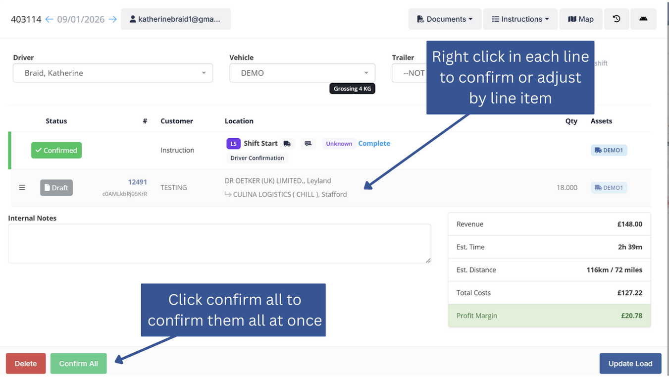 Once confirmed, allocated orders are visible on the Drivers App and you can track progress on the Traffic Sheet.