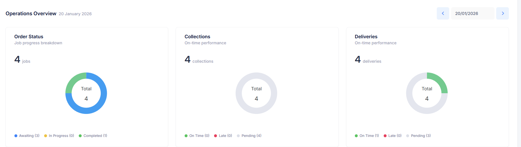 - Visual KPIs: At-a-glance charts track Order Status (Awaiting/In Progress/Completed), On-Time Performance for collections and deliveries, and Site Durations (time spent on-site).