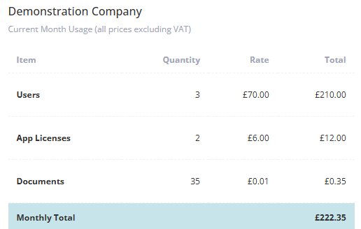 Monthly Charges Breakdown: A detailed breakdown of your current month charges based on TransMaS User count, App Usage, and Documents. Each item is shown with the quantity, rate, and total amount.