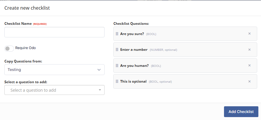 After defining your questions, you must combine them into at least one Checklist. The order in which questions are presented to the driver is determined by their order within the list.